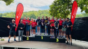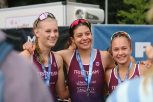 Um 9:00 Uhr starteten die Frauen, und wir schauten gespannt, wo man sich am besten platzieren sollte, um die Strömung der Mulde bestmöglich auszunutzen. Die Info, gut eine Woche vor dem Wettkampf, dass der abgestürzte Bundeswehrhubschrauber keine Gefahr darstellen würde, da das Kerosin weiter Flussabwärts ausgetreten ist, ließ unsere Damen noch ein wenig schneller Anschwimmen. Leider konnte Tamar krankheitsbedingt nicht teilnehmen. Das bedeutet, dass alle unserer Athletinnen ins Ziel kommen mussten, um ein vernünftiges Ergebnis zu erzielen. Beim Schwimmen waren die Mädels unglaublich stark und kamen gemeinsam aus dem Wasser. Ab auf’s Rad – dort wurde super im Team zusammengearbeitet.Die Strecke war ein ständiges Auf und Ab, und unsere Mädels haben sich nicht geschont, sondern sind mit voller Kraft gefahren, um den hinteren Gruppen keinen Funken Hoffnung zu geben. Auch beim Laufen waren alle richtig stark und haben noch einmal alles gegeben. Am Ende hat sich die Teamleistung ausgezahlt: Wir sind in der Gesamtwertung Erster geworden!